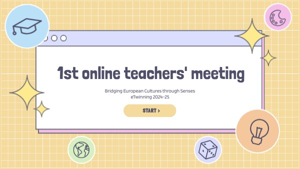 The first online teachers' meeting has been scheduled for Thursday, 24 October 2024, in order to get to know the members of the eTwinning project 2024-25, Bridging European Cultures through Senses. The meeting took place on the project's TwinSpace platform, at Online Meetings.