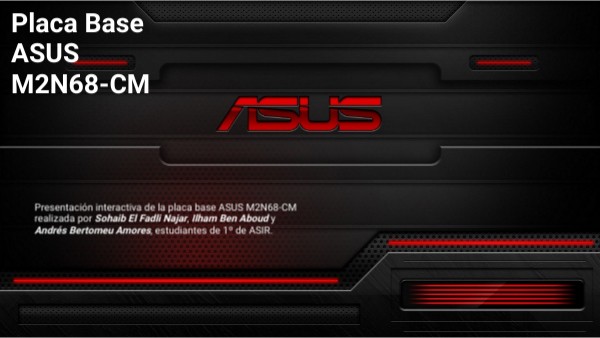 Presentación interactiva de la placa base ASUS M2N68-CM realizada por Sohaib El Fadli Najar, Ilham Ben Aboud y Andrés Bertomeu Amores, estudiantes de 1º de ASIR.