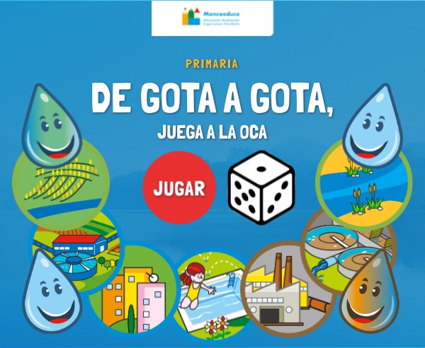 Juego tipo oca, que ayuda a comprender las etapas del ciclo natural y urbano del agua, fomentando hábitos responsables. ¿Ha jugado el alumnado alguna vez al juego de la oca? ¿Qué reglas conocen? En este caso, será una gota la que les acompañe en el viaje del agua; previamente, vendrá muy bien reconocer los dibujos de cada una de las casillas. El tablero tiene 30 casillas, con un borde de color según el agua esté en el ciclo natural (verde) o en el ciclo urbano (azul si es potable o marrón si está contaminada); hay gotas que saltan, puentes, tuberías e instalaciones de agua como un embalse, un manantial, un depósito, una potabilizadora y una depuradora.