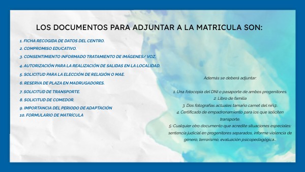 Además se deberá adjuntar: 1. Una fotocopia del DNI o pasaporte de ambos progenitores. 2. Libro de familia 3. Dos fotografías actuales tamaño carnet del niñ@. 4. Certificado de empadronamiento para los que soliciten transporte. 5. Cualquier otro documento que acredite situaciones especiales: sentencia judicial en progenitores separados, informe violencia de género, terrorismo, evaluación psicopedagógica...