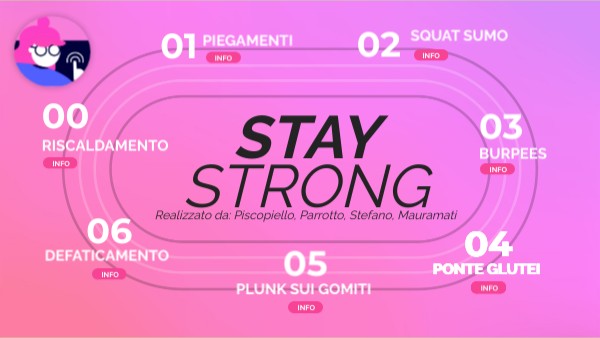 1. Stretching Statico dei Quadricipiti (30 secondi per gamba)2. Stretching del Bicipite Femorale (30 secondi per gamba) 3. Stretching delle Spalle e del Trapezio (30 secondi per lato) 4. Stretching addominale (30 secondi ) 5. Stretching del Petto (30 secondi PER LATO)