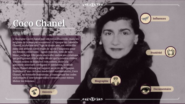 Gabrielle Chanel naît en 1883 à Saumur. Peu d’éléments parlent de l’enfance de la créatrice, elle-même se montre plutôt discrète sur cette période. Néanmoins, Gabrielle Chanel se révèle une enfant calme, solitaire et profondément attachée à son père. Un homme pourtant décrit comme morose et fréquemment absent, mais qu’elle idolâtre sans réserve. Entre 1907 et 1908, la jeune femme, décidée à sortir de sa modeste condition, fait ses débuts sur scène et chante dans les cafés-concerts. C’est à cette époque qu’elle se verra rebaptiser Coco par les officiers, qui avaient pris l’habitude de l'écouter chanter "Qui qu'a vu Coco dans l’'Trocadéro ?". Dès ses 20 ans, elle travaille dans un magasin de confection. Cinq ans plus tard, elle fait la rencontre d’Arthur Capel, qu’elle rejoint à Paris où elle ouvre son premier atelier de chapeaux. Le succès est rapidement au rendez-vous et la jeune couturière ouvre alors un second magasin à proximité de la place Vendôme, puis un troisième à Deauville et un autre à Biarritz. Elle se diversifie ensuite en se tournant vers la couture et ses créations trouvent leur public auprès d’une clientèle fortunée. Elle est la créatrice de la mode des cheveux courts, et surtout, elle prend part à la révolution féminine qui se joue : Coco Chanel remplace le contraignant corset par de simples robes et tailleurs. Muée par l’envie de libérer les femmes dans leurs activités quotidiennes, Coco Chanel élabore des collections à contre-courant : les formes s'élargissent, la taille se desserre et les jupes sont écourtées. Elle décède le 10 janvier 1971 à l’âge de 87 ans. Coco Chanel est enterrée à Lausanne, en Suisse, où elle avait une résidence et a choisi d'y être inhumée. Elle aimait cette ville pour sa tranquillité, sa stabilité et sa sécurité.