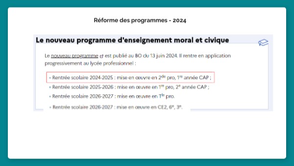 Nouveau programme 2024 - Préambule - Méthode :- L’EMC se déploie, dans la mesure du possible, à partir de l’examen de situations réelles (qui peuvent être issues de l’expérience des élèves eux-mêmes), d’analyses savantes (tirées de ressources scientifiques, historiques ou politiques) ou de descriptions imaginaires (puisées dans la littérature ou dans les arts, par exemple) - L'EMC contribue au développement des compétences orales - L'EMC s’appuie sur un ensemble de documents de référence (juridiques, historiques, patrimoniaux, littéraires, etc.) - Il est également un lieu de partage d’expériences (des élèves eux-mêmes qui ont pu connaître des expériences d’engagement, soit d’adultes sollicités dans ce but.)