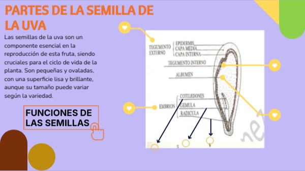 -Reproducción: "Las semillas permiten a las plantas reproducirse y dispersarse en nuevosambientes." -Germinación: "Cuando hay humedad y temperatura adecuadas, el embrión germina y se desarrolla en una nueva planta." -Diversidad Genética: "Las semillas contribuyen a la variabilidad de las vides” -Nutrición: Las semillas de uva son ricas en antioxidantes y otros compuestos beneficios