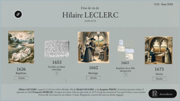 Hilaire LECLERC naquit le 11 février 1636 à Briollay. Fils de Michel LECLERC et de Jacquine PRIOU, il était leur premier enfant. il épousait en 1662 Françoise MOREAU, d'origine inconnue. Dix ans plus tard, en 1673, les époux moururent l'un après l'autre, à une semaine d'intervalle. Ils avaient eu six enfants. L'aînée, Marguerite, connut elle aussi un destin tragique.