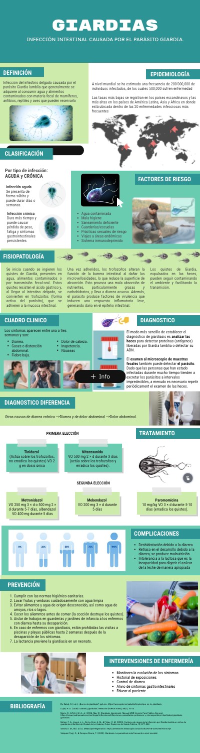 De Salud, S. (n.d.). ¿Que es la giardiasis? gob.mx. https://www.gob.mx/salud/articulos/que-es-la-giardiasis Luján, H. D. (2006). Giardia y giardiasis. Medicina (Buenos Aires), 66(1), 70-74. Marie, C., & Petri, W. A., Jr. (2024, May 9). Giardiasis (giardiosis). Manual MSD Versión Para Público General. https://www.msdmanuals.com/es/hogar/infecciones/infecciones-parasitarias-protozoos-y-microsporidios-intestinales/giardiasis-giardiosis Núñez, F. Á., López, J. L., De La Cruz, A. M., & Finlay, C. M. (2003). Factores de riesgo de la infección por Giardia lamblia en niños de guarderías infantiles de Ciudad de La Habana, Cuba. Cadernos de Saúde Pública, 19, 677-682. Sieloff, E. M., MD. (n.d.). Medscape Registration. https://emedicine.medscape.com/article/176718-overview?form=fpf Vázquez Tsuji, O., & Campos Rivera, T. (2009). Giardiasis. La parasitosis más frecuente a nivel mundial.