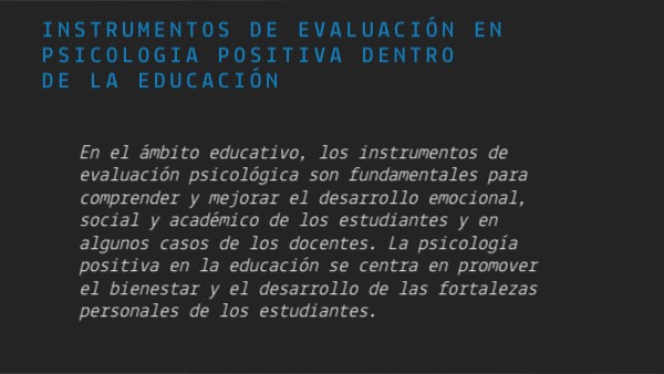 En el ámbito educativo, los instrumentos de evaluación psicológica son fundamentales para comprender y mejorar el desarrollo emocional, social y académico de los estudiantes y en algunos casos de los docentes. La psicología positiva en la educación se centra en promover el bienestar y el desarrollo de las fortalezas personales de los estudiantes.