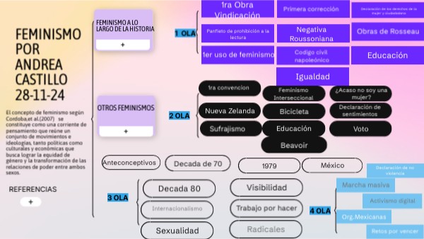 Cordova, D. G., Flores, E. N., García, R. R., & Salvador, J. C. R. (2007). ¿Qué significa el feminismo? Sus luchas históricas y aún vigentes. Ciencia UNAM. https://ciencia.unam.mx/leer/926/-que-significa-el-feminismo-sus-luchas-historicas-y-aun-vigentes- González, M. (2018). Breve recorrido por la historia del Feminismo. HistoriAgenda, 3(35), 106–113. Recuperado a partir de https://revistas.unam.mx/index.php/historiagenda/article/view/65416 Universidad Virtual del Estado de Guanajuato UVEG. (n.d.). Edu.Mx. Retrieved October 28, 2024, from https://avalicmod19c.uveg.edu.mx/mod/hvp/view.php?id=12543 Unwomen.org. (n.d.). Cronología: Mujeres Del Mundo, ¡únanse! Retrieved October 28, 2024, from https://interactive.unwomen.org/multimedia/timeline/womenunite/es/index.html#/1840 Valcárcel, A. (2001). La memoria colectiva y los retos del feminismo. CEPAL. Recuperado de https://repositorio.cepal.org/handle/11362/5877 Veléz G., Benitéz F. (2018). Principales retos y logros del feminismo de México. Redalyc.org. https://www.redalyc.org/journal/676/67658324006/