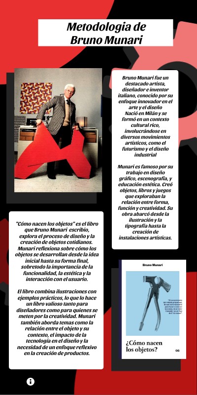 Bruno Munari fue un destacado artista, diseñador e inventor italiano, conocido por su enfoque innovador en el arte y el diseño Nació en Milán y se formó en un contexto cultural rico, involucrándose en diversos movimientos artísticos, como el futurismo y el diseño industrial Munari es famoso por su trabajo en diseño gráfico, escenografía, y educación estética. Creó objetos, libros y juegos que exploraban la relación entre forma, función y creatividad. Su obra abarcó desde la ilustración y la tipografía hasta la creación de instalaciones artísticas.