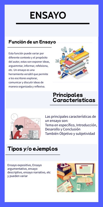 Esta función puede variar por diferente contexto y el propósito del autor, estas son exponer ideas, arguemntar, informar, refelxiona, etc. Un ensayo es una herramienta versátil que permite a los escritores explorar, comunicar y discutir ideas de manera organizada y reflexiva.