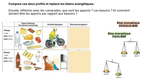 Compare ces deux profils et replace les bilans energétiques. Ensuite, réfléchis avec tes camarades, que sont les apports ? Les besoins ? Et comment doivent être les apports par rapport aux besoins ?
