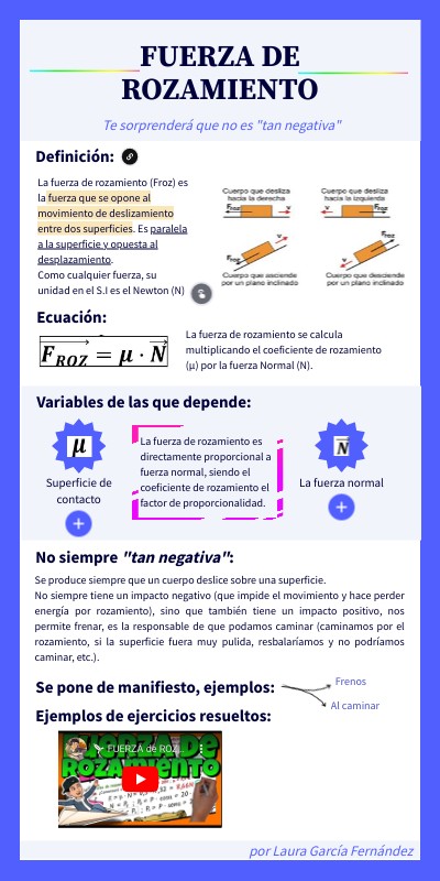 La fuerza de rozamiento (Froz) es la fuerza que se opone al movimiento de deslizamiento entre dos superficies. Es paralela a la superficie y opuesta al desplazamiento. Como cualquier fuerza, su unidad en el S.I es el Newton (N)