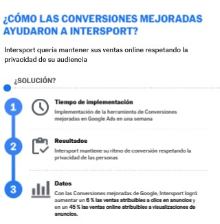 Con las Conversiones mejoradas de Google, Intersport logró aumentar un 6 % las ventas atribuibles a clics en anuncios y en un 45 % las ventas online atribuibles a visualizaciones de anuncios.