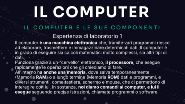 Il computer è una macchina elettronica che, tramite vari programmi riesce ad elaborare, trasmettere e immagazzinare determinati dati. Il computer è in grado di eseguire sia calcoli matematici molto complessi, sia altri tipi di dati. Funziona grazie a un "cervello" elettronico, il processore, che esegue rapidamente le operazioni che gli chiediamo di fare. All'interno ha anche una memoria, dove salva temporaneamente (Memoria RAM) o a lungo termine (Memoria ROM) dati e programmi, e diversi strumenti, come tastiera, schermo e mouse, che ci permettono di interagire con lui. In sostanza, noi diamo comandi al computer, e lui li esegue seguendo precise istruzioni, chiamate programmi o software.