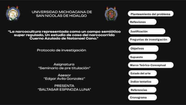Capitulo 1. Metodología 1.1. Semiótica 1.2. Campos Semioticos 1.3. Campo super regulados de producción semiótica Capitulo 2. La Narcocultura 2.1. Narcocultura: Definición y Contexto 2.2. Origen y Evolución de los Narcocorridos 2.3. Características y Temáticas de los Narcocorridos Capitulo 3. Análisis de Cuerno Azulado 3.1 Análasis de la letra 3.2 Conclusiones del análisis 3
