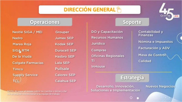 NOTA: Al pasar el mouse sobre las cuentas o áreas y dar clic en ellas te redireccionan a su equipo de trabajo.