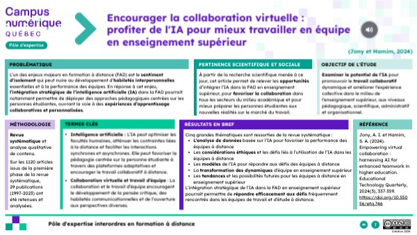 Pour citer ce document : Pôle d’expertise interordres en formation à distance (2024). Encourager la collaboration virtuelle : profiter de l'IA pour mieux travailler en équipe en enseignement supérieur [Fiche de lecture de Empowering virtual collaboration: harnessing AI forenhanced teamwork in higher education, par A.I. Jony et S.A. Hamim, 2024]. Campus numérique Québec. Licence CC BY-NC-SA. https://view.genially.com/67212dc8186834c1adc60ba6