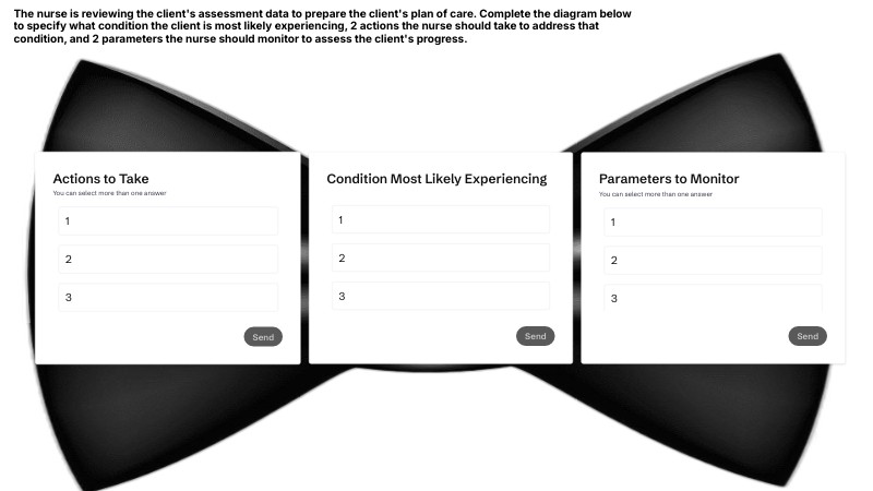 The nurse is reviewing the client's assessment data to prepare the client's plan of care. Complete the diagram below to specify what condition the client is most likely experiencing, 2 actions the nurse should take to address that condition, and 2 parameters the nurse should monitor to assess the client's progress.