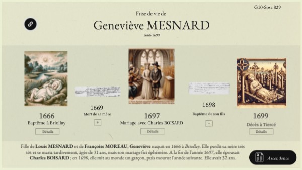Fille de Louis MESNARD et de Françoise MOREAU, Geneviève naquit en 1666 à Briollay. Elle perdit sa mère très tôt et se maria tardivement, âgée de 31 ans, mais son mariage fut éphémère. A la fin de l'année 1697, elle épousait Charles BOISARD ; en 1698, elle mit au monde un garçon, puis mourut l'année suivante. Elle avait 32 ans.