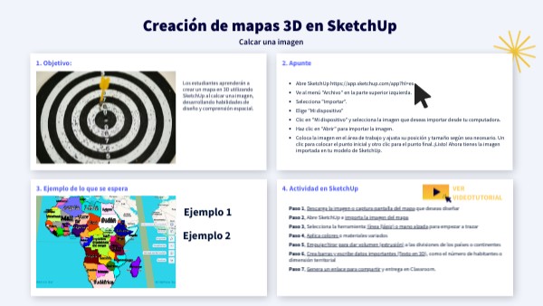 Los estudiantes aprenderán a crear un mapa en 3D utilizando SketchUp al calcar una imagen, desarrollando habilidades de diseño y comprensión espacial.