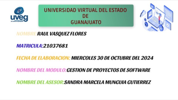 NOMBRE:RAUL VASQUEZ FLORESMATRICULA:21037681 FECHA DE ELABORACION: MIERCOLES 30 DE OCTUBRE DEL 2024 NOMBRE DEL MODULO:GESTION DE PROYECTOS DE SOFTWARE NOMBRE DEL ASESOR:SANDRA MARCELA MUNGUIA GUTIERREZ