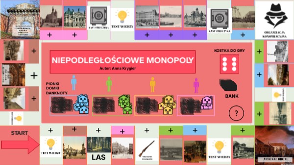 WYJŚCIE Z CYTADELI - koszt 100 banknotów albo czekacie kolejkę ORGANIZACJA KONSPIRACYJNA - za działanie w organizacji każdy z członków z waszej drużyny dostaje po 10 banknotów ARSENAŁ BRONI - za to, że opanowaliście arsenał broni, dostajecie jako oddział, 50 banknotów TEST WIEDZY - za poprawną odpowiedź dostajecie 30 banknotów (nauczyciel czyta jedno z pytań) KASA STEFCZYKA - czytacie jedną karteczkę z góry (te kartki nauczyciel ma na biurku) LAS - musicie się schować w lesie, więc czekacie jedną kolejkę SZKOLENIE WOJSKOWE - Przykładni z was Polacy. Za udział w szkoleniu wojskowym każdy z członków waszego oddziału dostaje po 10 banknotów. Jeśli kupicie jakieś miejsce, to stawiacie tam domek swojego koloru. Pieniądze możecie zapisywać na tablicy albo przesuwać banknoty z banku i do banku. Za przejście przez START dostajecie 50 banknotów.