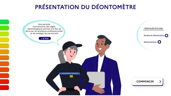 Lors d’une rencontre réunissant en mars 2021 à l’ENAP les référents interrégionaux de déontologie et les stagiaires DPIP 14 et DSP 50, l’idée d’un outil d’aide à la réflexion sur des postures professionnelles a émergé. Et chemin faisant, le déontomètre s’est progressivement imposé. Inspiré du violentomètre dont il reprend les codes et les couleurs, ce déontomètre, de sa conception à sa réalisation numérique, a sollicité le travail conjoint de différents acteurs de l’administration pénitentiaire : la MCI, garante de la déontologie, les référents interrégionaux de déontologie, l’ENAP, l’atelier pédagogique du numérique, les stagiaires DPIP 15 et DSP 51 lors du séminaire « L’éthique en pratique(s) » organisé par l’ENAP en mars 2023.