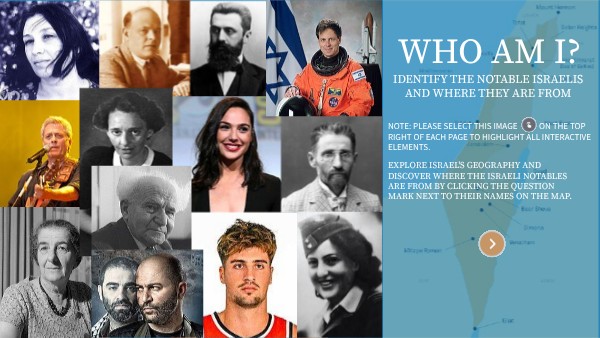explore Israel's geography and discover where the Israeli notables are from by clicking the question mark next to their names on the map.