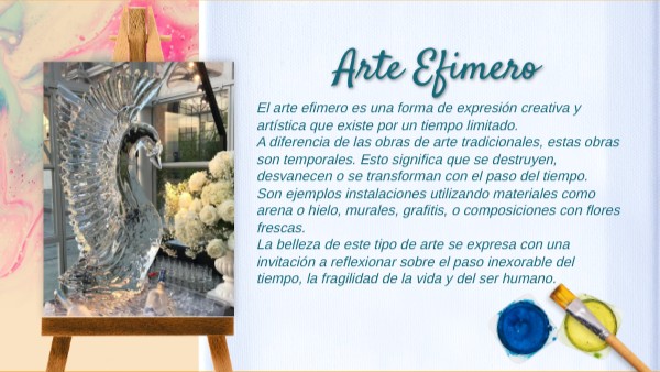 El arte efimero es una forma de expresión creativa y artística que existe por un tiempo limitado. A diferencia de las obras de arte tradicionales, estas obras son temporales. Esto significa que se destruyen, desvanecen o se transforman con el paso del tiempo. Son ejemplos instalaciones utilizando materiales como arena o hielo, murales, grafitis, o composiciones con flores frescas.La belleza de este tipo de arte se expresa con una invitación a reflexionar sobre el paso inexorable del tiempo, la fragilidad de la vida y del ser humano.