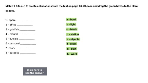 Match 1–8 to a–h to create collocations from the text on page 46. Choose and drag the green boxes to the blank spaces. 1 - spare ______________ 2 - office ______________ 3 - goldfish ______________ 4 - natural ______________ 5 - outside ______________ 6 - personal ______________ 7 - work ______________ 8 - purpose ______________