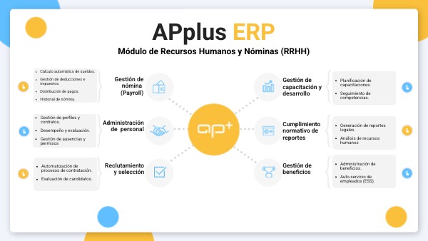 El módulo de Recursos Humanos y Nómina en APplus-ERP automatiza la gestión de empleados, desde la contratación hasta el cálculo de nóminas y beneficios, asegurando precisión y cumplimiento legal en los pagos. Además, centraliza información clave sobre el desempeño y el desarrollo del personal, facilitando la planificación de talento y la toma de decisiones estratégicas en el área de recursos humanos.