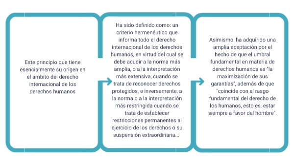 Ha sido definido como: un criterio hermenéutico que informa todo el derecho internacional de los derechos humanos, en virtud del cual se debe acudir a la norma más amplia, o a la interpretación más extensiva, cuando se trata de reconocer derechos protegidos, e inversamente, a la norma o a la interpretación más restringida cuando se trata de establecer restricciones permanentes al ejercicio de los derechos o su suspensión extraordinaria...