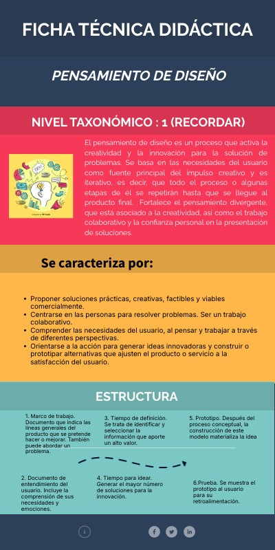 El pensamiento de diseño es un proceso que activa la creatividad y la innovación para la solución de problemas. Se basa en las necesidades del usuario como fuente principal del impulso creativo y es iterativo, es decir, que todo el proceso o algunas etapas de él se repetirán hasta que se llegue al producto final. Fortalece el pensamiento divergente, que está asociado a la creatividad, así como el trabajo colaborativo y la confianza personal en la presentación de soluciones.