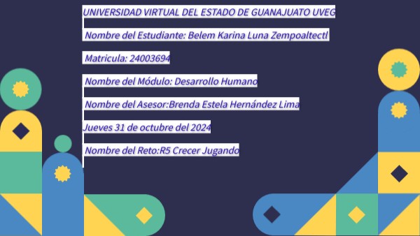 UNIVERSIDAD VIRTUAL DEL ESTADO DE GUANAJUATO UVEG Nombre del Estudiante: Belem Karina Luna Zempoaltectl Matricula: 24003694 Nombre del Módulo: Desarrollo Humano Nombre del Asesor:Brenda Estela Hernández Lima Jueves 31 de octubre del 2024 Nombre del Reto:R5 Crecer Jugando