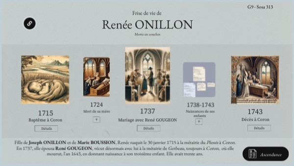 Fille de Joseph ONILLON et de Marie BOUSSION, Renée naquit le 30 janvier 1715 à la métairie du Plessis à Coron. En 1737, elle épousa René GOUGEON, vécut désormais avec lui à la métairie de Gerbeau, toujours à Coron, où elle mourut, l'an 1643, en donnant naissance à son troisième enfant. Elle avait trente ans.