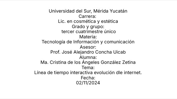 Universidad del Sur, Mérida Yucatán Carrera: Lic. en cosmética y estética Grado y grupo: tercer cuatrimestre único Materia: Tecnología de Información y comunicación Asesor: Prof. José Alejandro Concha Uicab Alumna: Ma. Cristina de los Ángeles González Zetina Tema: Línea de tiempo interactiva evolución dle internet. Fecha: 02/11/2024