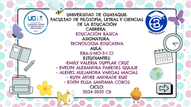 UNIVERSIDAD DE GUAYAQUILFACULTAD DE FILOSOFÍA, LETRAS Y CIENCIAS DE LA EDUCACIÓNCARRERA: EDUCACIÓN BÁSICA ASIGNATURA: TECNOLOGÍA EDUCATIVA AULA: EBA-S-NO-5-1 C1 ESTUDIANTES: -EMILY VALERIA DUFFLAR CRUZ - EVELYN ALEXANDRA PAREDES QUIJIJE - ALENYS ALEJANDRA VARGAS MACIAS - RUTH AYDEE ANDRADE RUIZ - EDITH ELISA SANTANA COBOS CICLO: 2024-2025 CII
