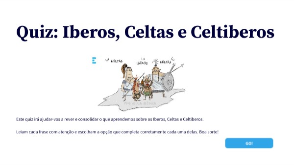 Este quiz irá ajudar-vos a rever e consolidar o que aprendemos sobre os Iberos, Celtas e Celtiberos. Leiam cada frase com atenção e escolham a opção que completa corretamente cada uma delas. Boa sorte!