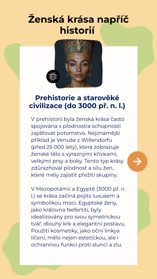 V prehistorii byla ženská krása často spojována s plodnostía schopností zajišťovat potomstvo. Nejznámější příklad je Venuše z Willendorfu (před 25 000 lety), která zobrazuje ženské tělo s výraznými křivkami, velkými prsy a boky. Tento typ krásy zdůrazňoval plodnost a sílu žen, které měly zajistit přežití skupiny. V Mezopotámii a Egyptě (3000 př. n. l.) se krása začíná pojits luxusem a symbolikou moci. Egyptské ženy, jako královna Nefertiti, byly idealizovány pro svou symetrickou tvář, dlouhý krk a elegantní postavu. Použití kosmetiky, jako oční linkya líčení, mělo nejen estetickou, ale i ochrannou funkci proti slunci a zlu.