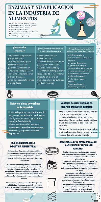 Revisión en español sobre los tipos de enzimas más utilizadas en la industria alimentaria y sus aplicaciones.Sharma, R., y Verma, R. (2020). Aplicaciones industriales de la biotecnología enzimática: una descripción general. Revista internacional de ciencia y biotecnología de los alimentos , 5(3), 72-81. Artículo en inglés que explora aplicaciones enzimáticas en varias industrias, con énfasis en el sector alimentario. Torres, M. y Sandoval, P. (2021). Enzimas en la industria alimentaria: Eficiencia y sostenibilidad. Revista de Investigación Alimentaria , 10(4), 89-97. Investigación sobre la contribución de las enzimas en la sostenibilidad y eficiencia de procesos alimentarios.