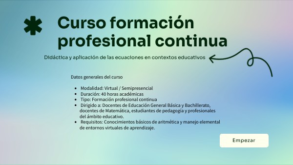 Las ecuaciones constituyen un eje estructural del pensamiento algebraico y del razonamiento matemático. Sin embargo, su enseñanza suele centrarse en procedimientos mecánicos, lo que limita la comprensión conceptual y la transferencia a situaciones reales. Este curso responde a la necesidad de fortalecer la didáctica de las ecuaciones, integrando enfoques activos, recursos digitales y estrategias contextualizadas que favorezcan el aprendizaje significativo y funcional.