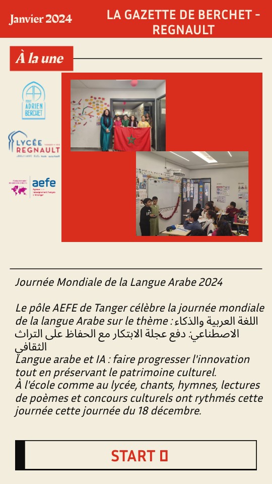 Journée Mondiale de la Langue Arabe 2024 Le pôle AEFE de Tanger célèbre la journée mondiale de la langue Arabe sur le thème : اللغة العربية والذكاء الاصطناعي: دفع عجلة الابتكار مع الحفاظ على التراث الثقافي Langue arabe et IA : faire progresser l'innovation tout en préservant le patrimoine culturel. À l'école comme au lycée, chants, hymnes, lectures de poèmes et concours culturels ont rythmés cette journée cette journée du 18 décembre.