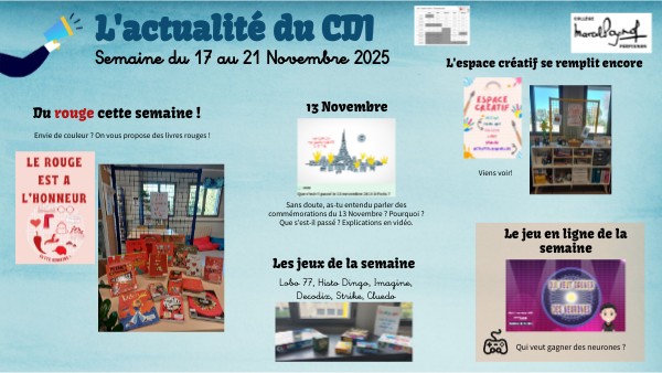 Chaque semaine, retrouvez ici le bulletin d'informations du CDI. Découvrez : - Les dernières infos - Les 6 jeux de la semaine - Une sélection de livres du CDI en lien avec l'actualité - Les grandes infos du Monde qui nous concernent tous