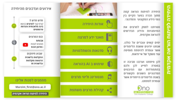 החל משנת תשפ"ד מרצים חדשים בקריה האקדמית אונו יקבלו מעטפת מקצועית הכוללת שני מרכיבים עיקריים: קורס למרצים חדשים מנטורינג למרצים חדשים הכוללים צפיה בשיעור וקבלת משוב בונה והמשך ליווי בהתאם לצורך.