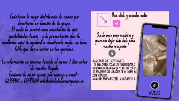 Cuéntanos la mejor distribución de camas por dormitorios en función de tu grupo.El audio te servirá como orientación de qué posibilidades tenéis , y la presentación que te mandamos aquí te ayudará a visualizarlo mejor, no hace falta que des a enviar en las opciones. La información es precisa tenerla al menos 7 días antes de vuestra llegada Envíanos tu mejor opción por wassup o email : 627544112 o 655476101 info@elnidodelasmariposas.es