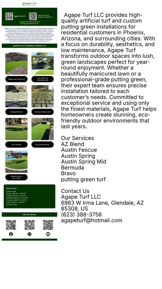 Agape Turf LLC provides high-quality artificial turf and custom putting green installations for residential customers in Phoenix, Arizona, and surrounding cities. With a focus on durability, aesthetics, and low maintenance, Agape Turf transforms outdoor spaces into lush, green landscapes perfect for year-round enjoyment. Whether a beautifully manicured lawn or a professional-grade putting green, their expert team ensures precise installation tailored to each customer’s needs. Committed to exceptional service and using only the finest materials, Agape Turf helps homeowners create stunning, eco-friendly outdoor environments that last years. Our Services AZ Blend Austin Fescue Austin Spring Austin Spring Mid Bermuda Bravo putting green turf Contact Us Agape Turf LLC 6963 W Irma Lane, Glendale, AZ 85308, US (623) 388-3758 agapeturf@hotmail.com