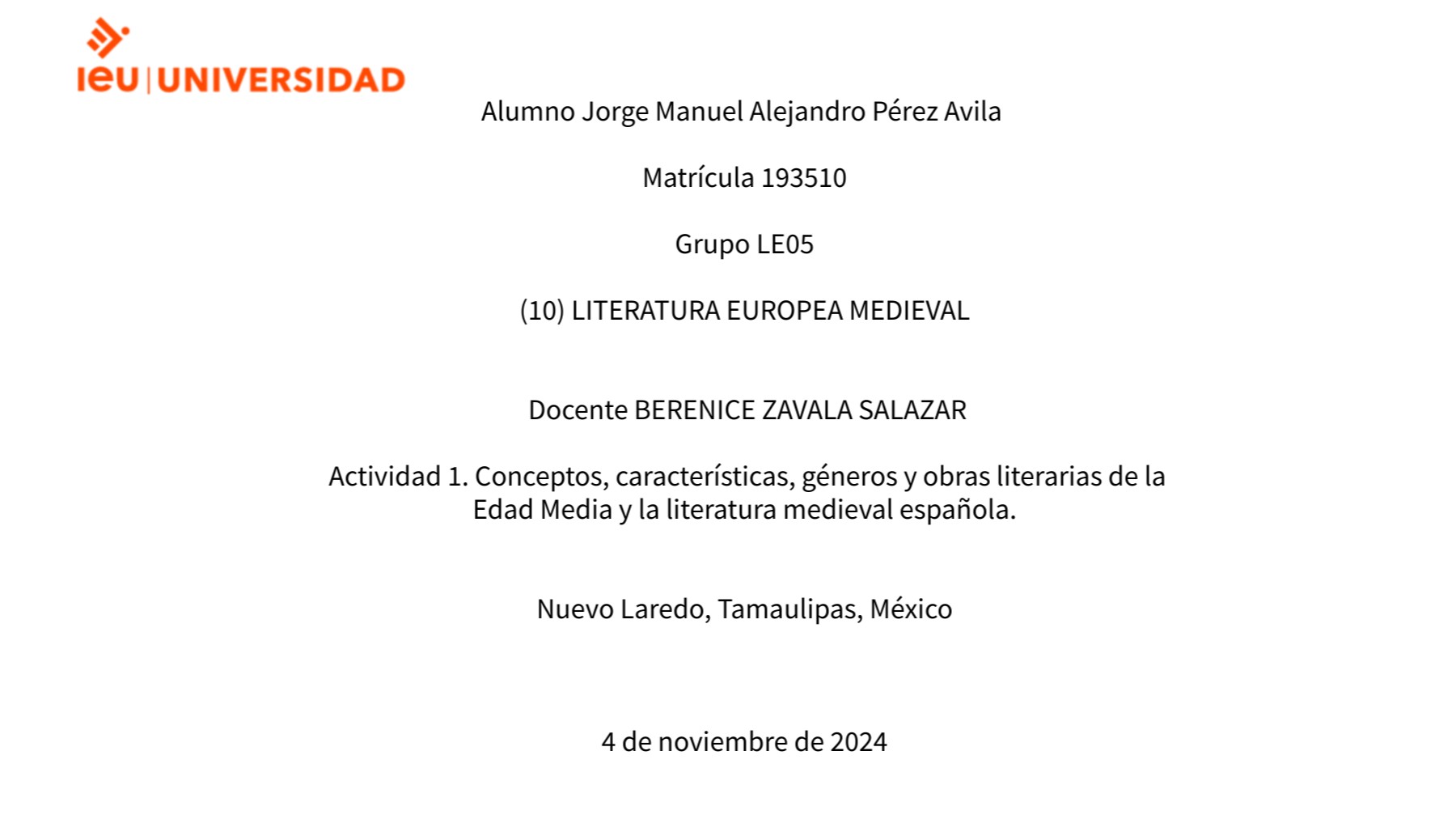 Alumno Jorge Manuel Alejandro Pérez Avila Matrícula 193510 Grupo LE05 (10) LITERATURA EUROPEA MEDIEVAL Docente BERENICE ZAVALA SALAZAR Actividad 1. Conceptos, características, géneros y obras literarias de la Edad Media y la literatura medieval española. Nuevo Laredo, Tamaulipas, México 4 de noviembre de 2024