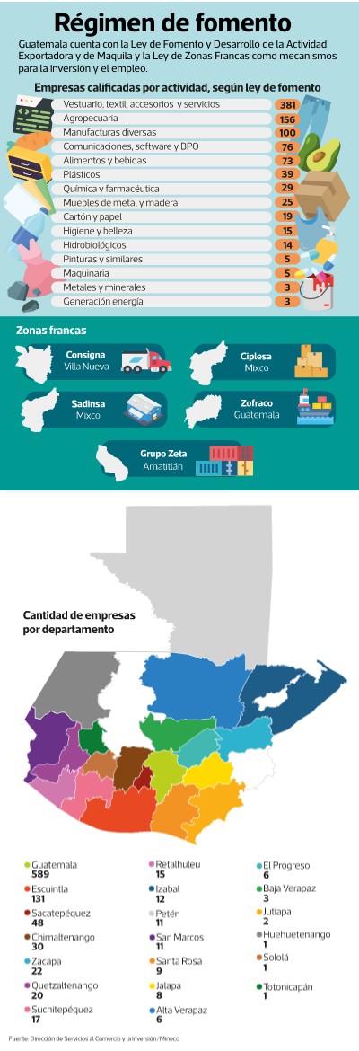 Guatemala cuenta con la Ley de Fomento y Desarrollo de la Actividad Exportadora y de Maquila y la Ley de Zonas Francas como mecanismos para la inversión y el empleo.