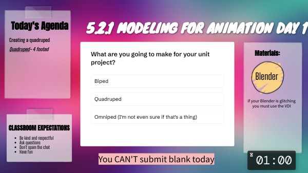 If you finished & saved the quadruped from the last lesson - you can turn that in today