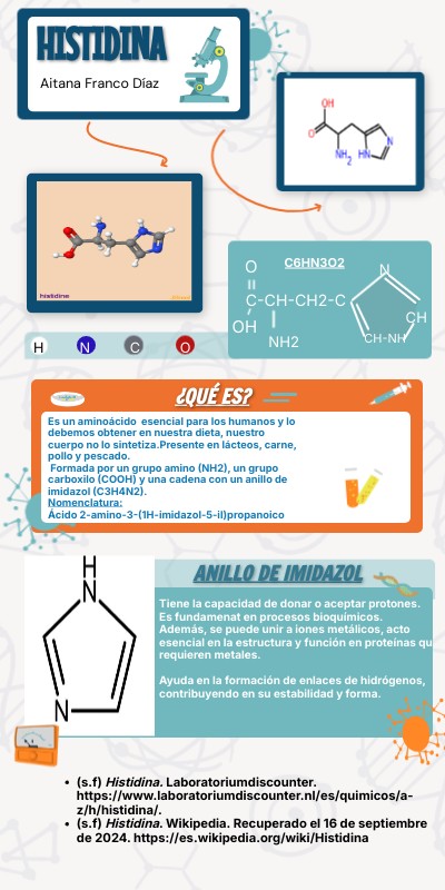 - (s.f) Histidina. Wikipedia. Recuperado el 16 de septiembre de 2024. https://es.wikipedia.org/wiki/Histidina